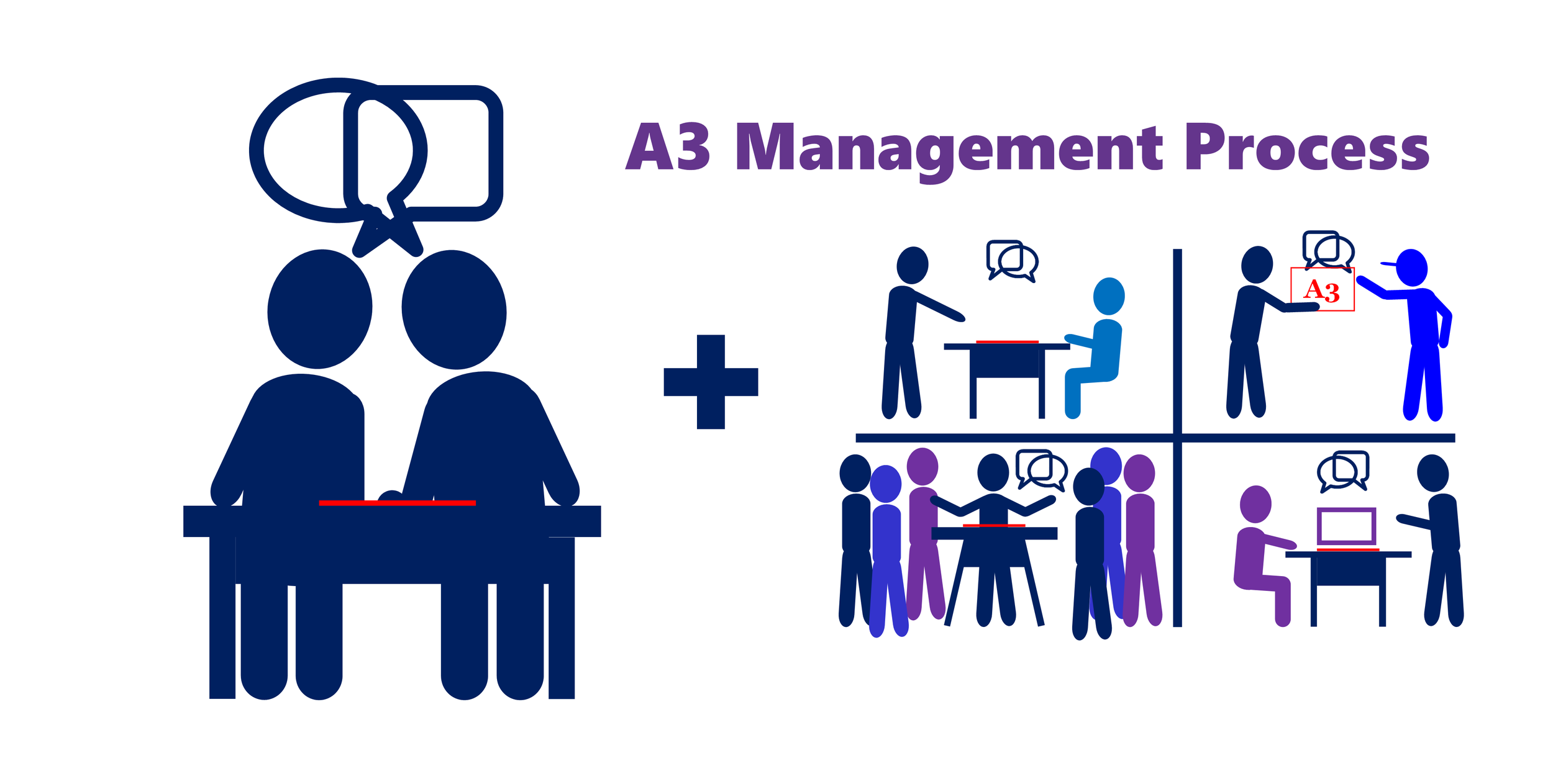 A3 refers to the document that is at the centre of the problem-solving or improvement issue that is being worked on. The term ‘A3’ refers to the paper size of this single page document. It has it’s origins in late 1970’s Toyota and to this day is at the heart of their management processes at all levels!